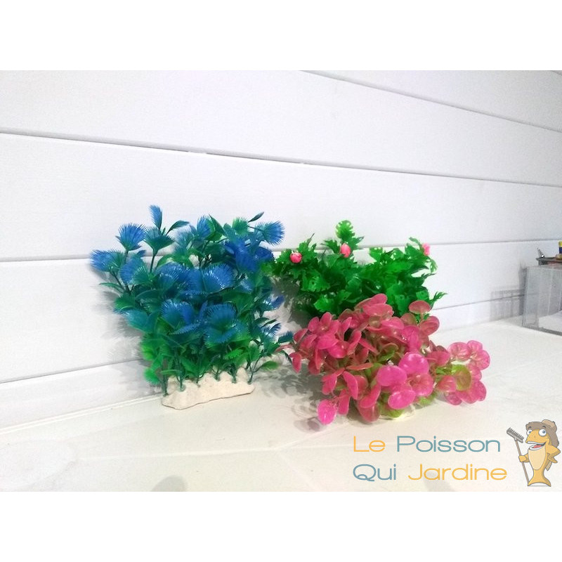 Plantes plastiques très colorées à placer avec d'autres plantes et / ou d'autres décorations d'aquarium comme amphores, racines ou roches.
