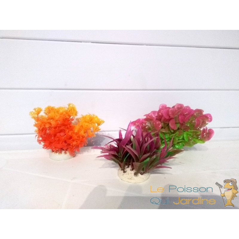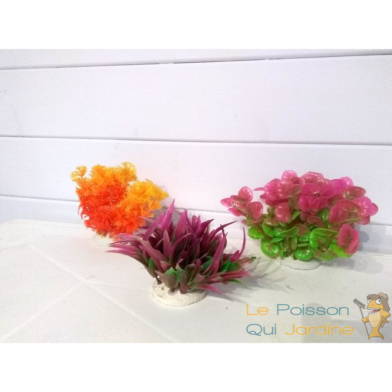 Plantes plastiques très colorées à placer avec d'autres plantes et / ou d'autres décorations d'aquarium comme amphores, racines ou roches.