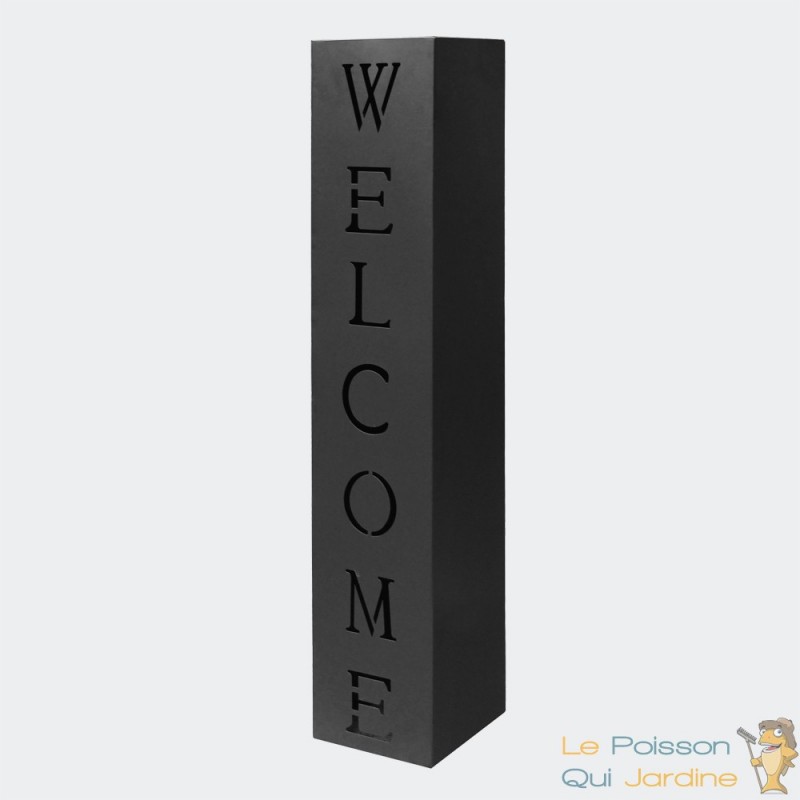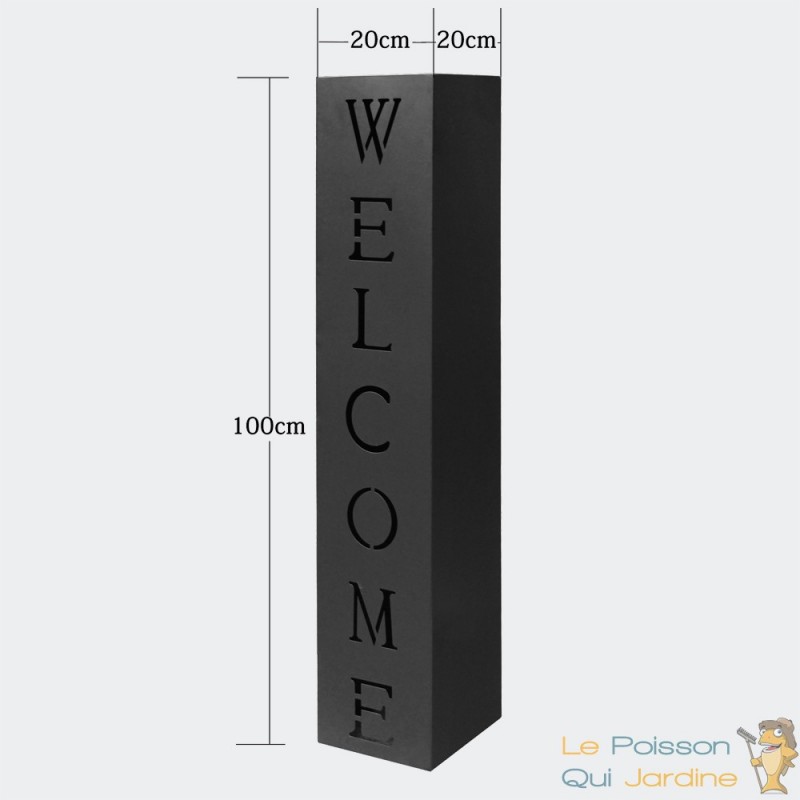Notre colonne décorative pour jardin est un outil idéal pour ajouter une touche de style à votre extérieur. Elle est fabriquée à partir de métal noir, robuste et résistante aux intempéries pour une utilisation à l'extérieur. Elle est décorée avec une calligraphie en relief Welcome (bienvenue) pour un accueil chaleureux à vos invités.