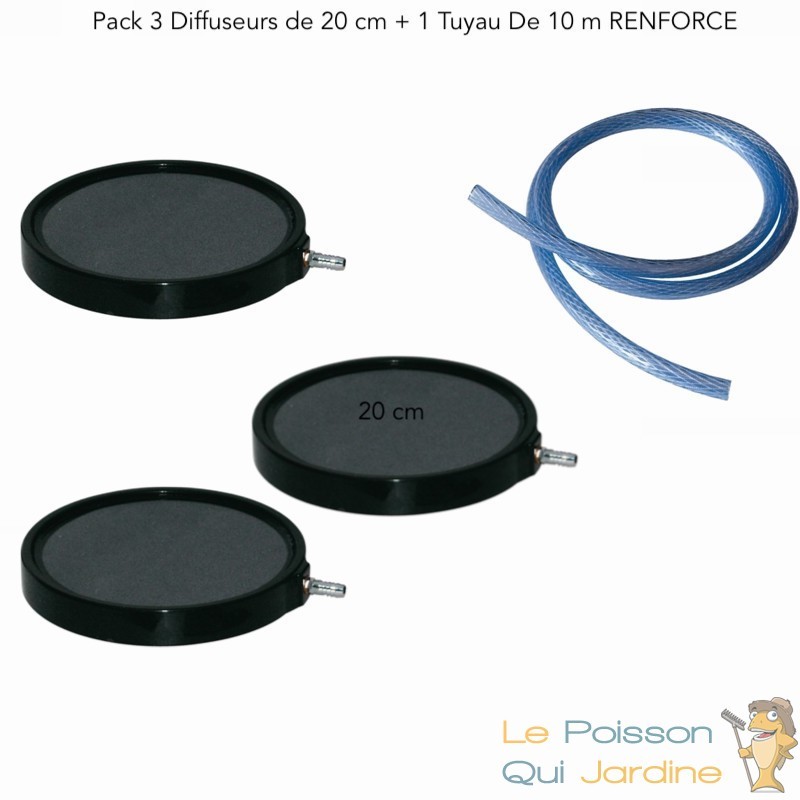 Pensez à placer une pompe à air assez puissante pour que la diffusion des bulles soit complète sur le diffuseur pour une utilisation en aquarium. Et pensez surtout, à placer plusieurs diffuseurs aux endroits stratégiques du bassin afin que la diffusion d'oxygène soit optimale et que le taux d'oxygène soit homogène dans l'ensemble de l'étang. il ne faut pas créer de zones où le taux d'oxygène est bas.