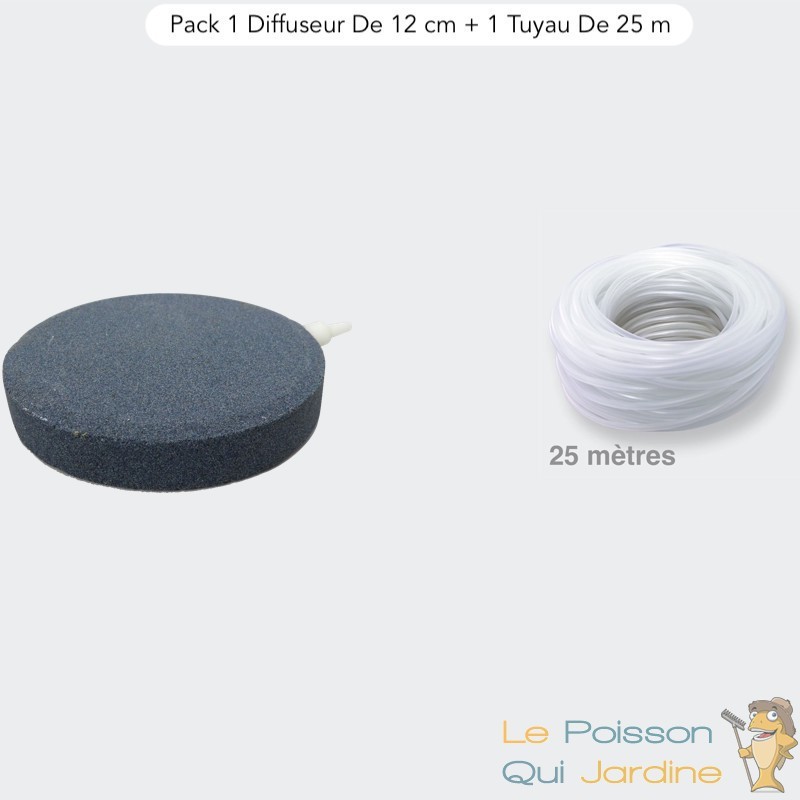 Nous vous proposons un diffuseur d'air circulaire ou disque de 12 cm ( 120 mm ) + 1 tuyau de 25 mètres à brancher sur une pompe à air d'aquarium ou sur un compresseur aérateur de bassins de jardin.