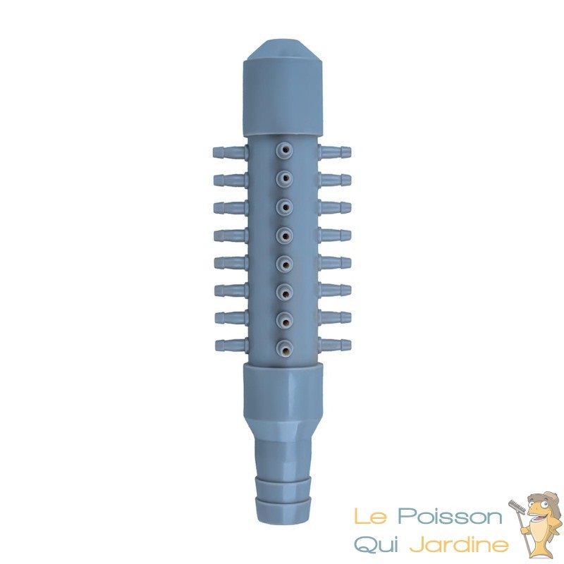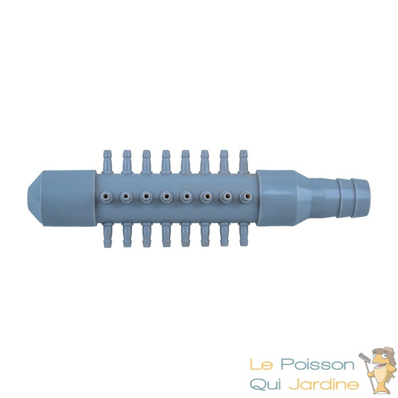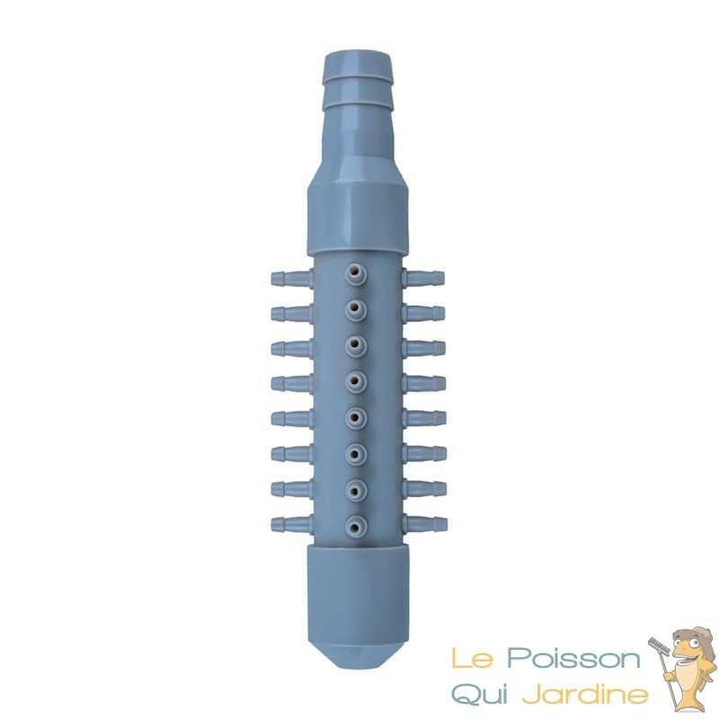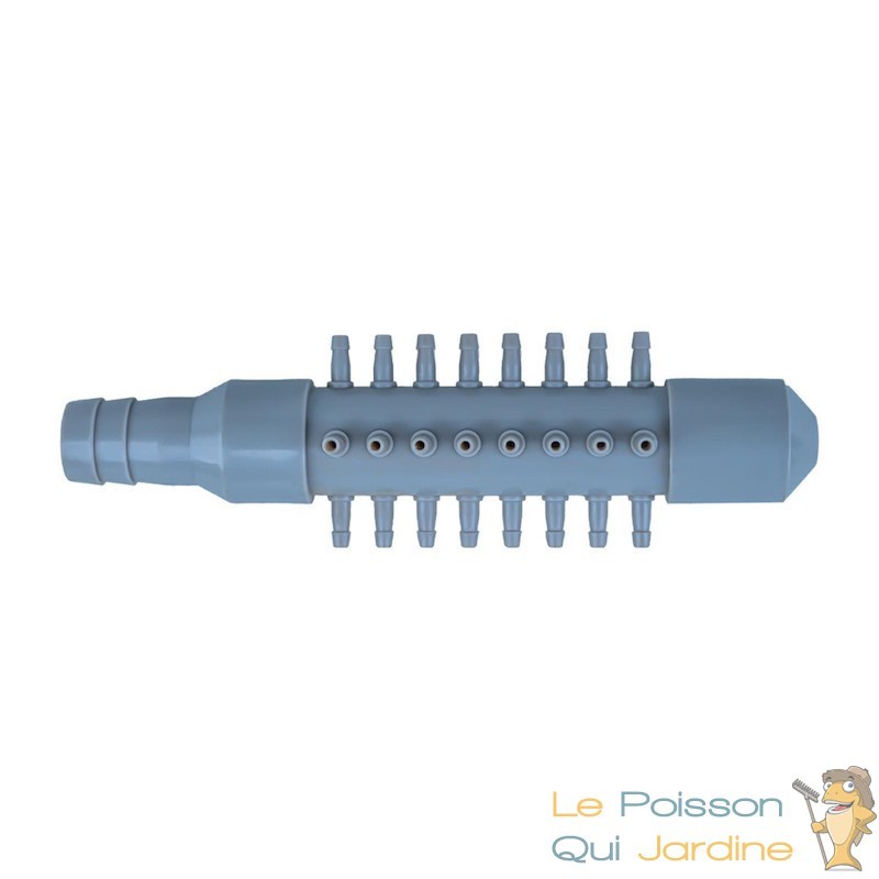L'utilisation est simple. Il suffit de la brancher au compresseur ou à la pompe à air et ensuite, de " partir " avec du tuyau cristal sur chacune des sorties. Au bout du tuyau, on ajoutera un diffuseurs d'air afin de diffuser les bulles d'air.