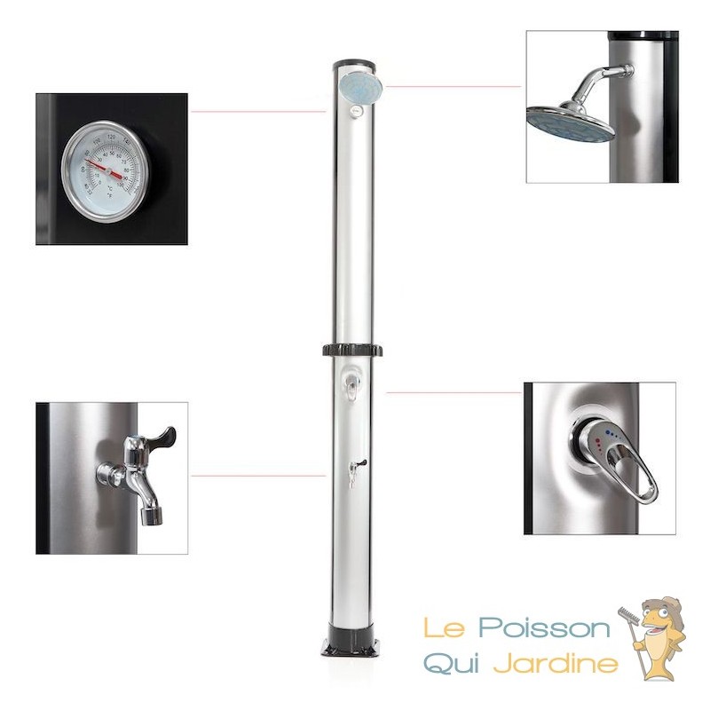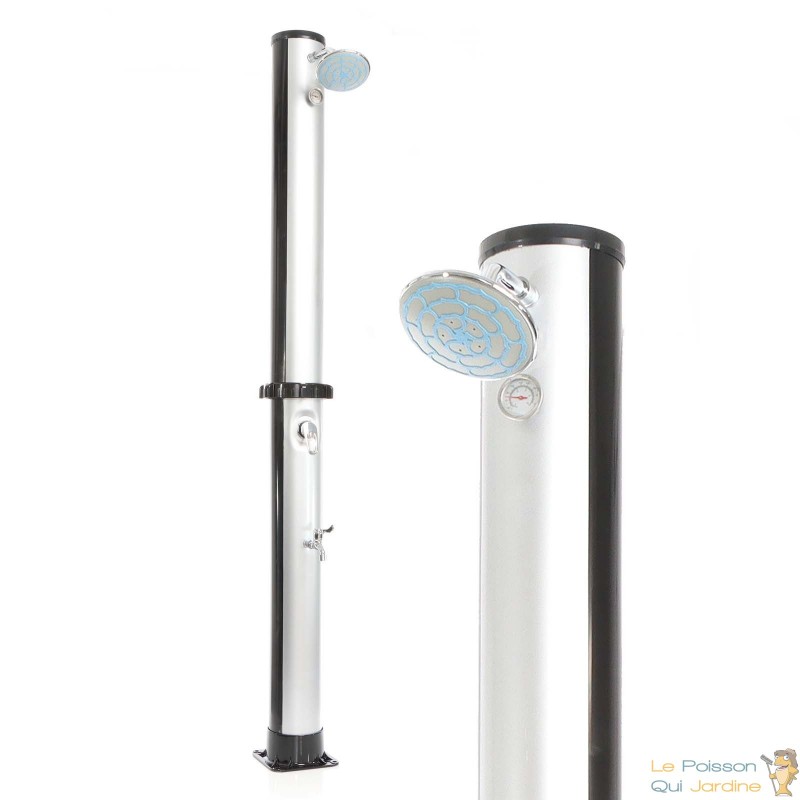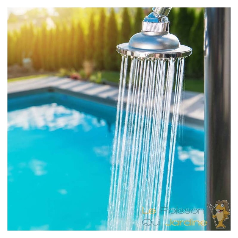 Plongez dans une expérience de douche revitalisante avant et après votre baignade dans la piscine avec notre douche solaire. Cette douche vous offre un pommeau de douche généreux placé en hauteur pour vous offrir une sensation de douche sous une pluie rafraîchissante, créant ainsi une ambiance de spa et de bien-être. La douche est également équipée d'un robinet mitigeur pour un réglage en continu de la température de l'eau, ainsi que d'un robinet supplémentaire pour vous permettre de vous laver les pieds facilement.