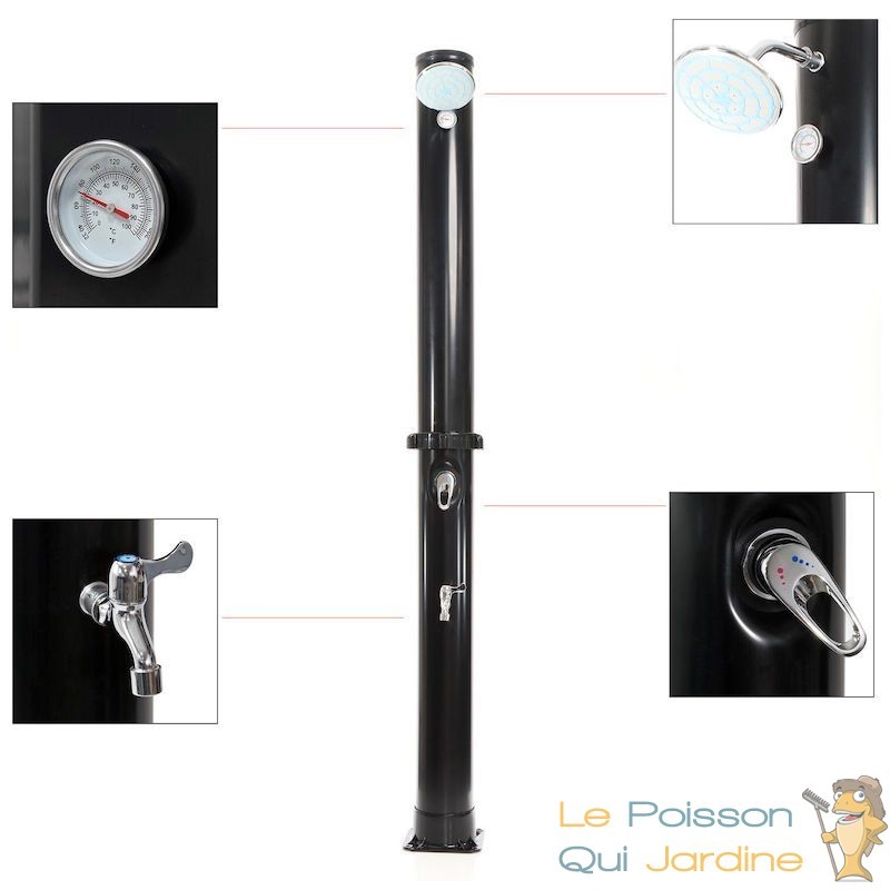 Le réservoir intégré à la douche stocke l'eau qui est chauffée grâce à l'exposition directe aux rayons solaires. La couleur noire du réservoir favorise l'absorption de la chaleur, permettant ainsi à l'eau d'être réchauffée naturellement, sans coûts supplémentaires. Un thermomètre intégré vous permet de vérifier la température de l'eau.