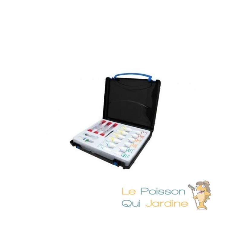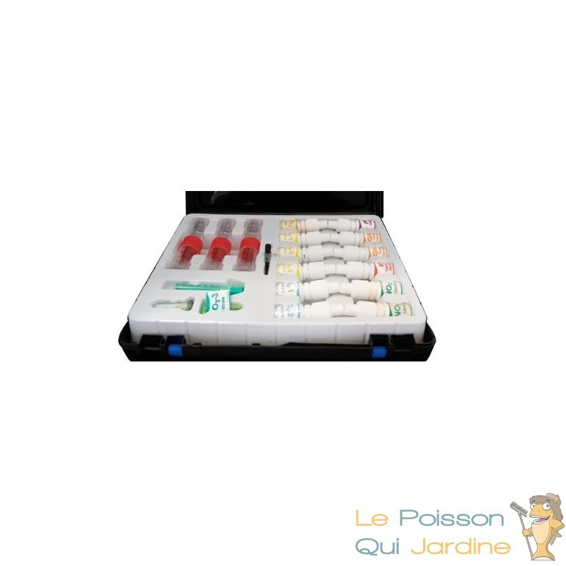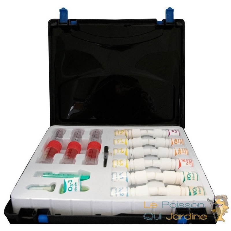 Cette valisette regroupe 7 tests d’eau essentiels, chacun permettant environ 40 mesures : pH : mesure de l’acidité de l’eau KH : dureté carbonatée GH : dureté totale NH3 : ammoniac NO2 : nitrites NO3 : nitrates PO4 : phosphates Le test des phosphates, rarement inclus dans les mallettes standards, permet un suivi avancé de la qualité de l’eau, particulièrement utile pour prévenir les algues.