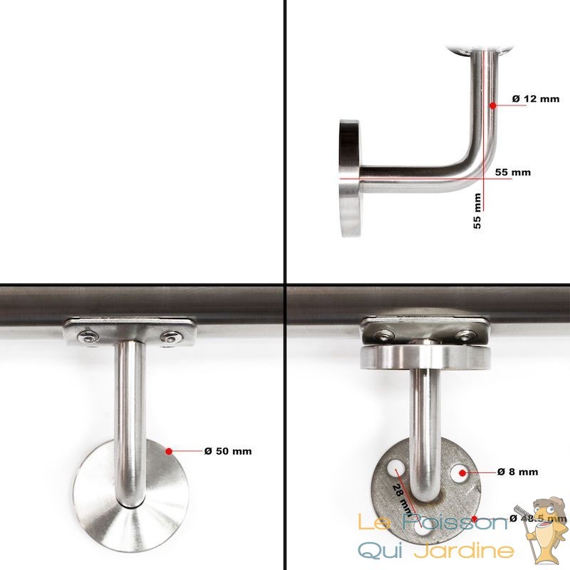 Le diamètre de la main courante est de 4,2 cm et le diamètre des supports d'attache est de 12 mm.