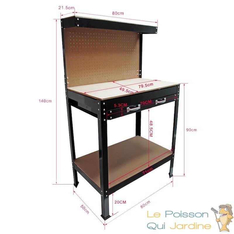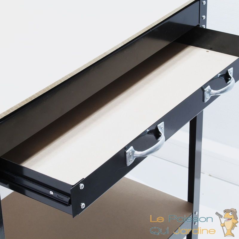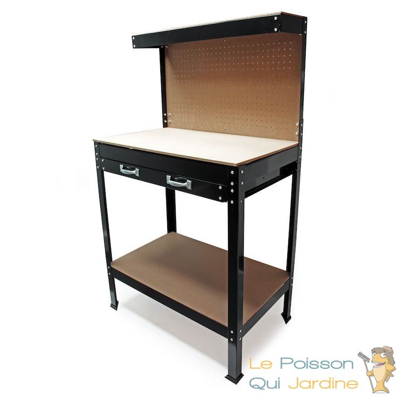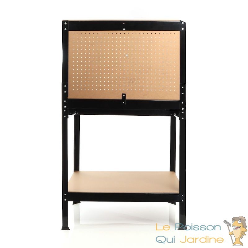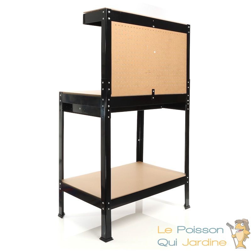 Grâce à cette disposition ingénieuse, vous pouvez organiser efficacement votre espace de travail, en maintenant une surface de travail propre et bien ordonnée. Le tiroir permet de garder à portée de main les éléments les plus utilisés ou les plus fragiles, tandis que l'étagère offre un espace de rangement pratique pour les outils et équipements plus encombrants. En résumé, cette conception astucieuse de l'établi vous permet de maximiser l'efficacité de votre espace de travail tout en maintenant une organisation optimale de vos outils et accessoires.