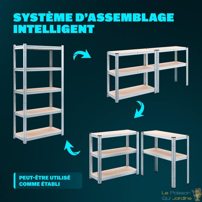 Notre catalogue propose une gamme complète d'étagères adaptées au rangement de pneus, d'outils de bricolage, de matériel lourd et fragile. Chaque étagère peut supporter jusqu'à 875 kg de poids total, avec une répartition équilibrée de 175 kg par plateau. Leur construction en acier garantit une grande robustesse, et leur montage est facile. Grâce à leur caractère modulaire, ces étagères s'adaptent parfaitement aux espaces restreints des serres, abris de jardin, garages, caves, plafonds mansardés et escaliers.