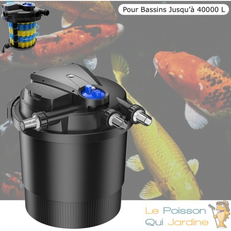 Découvrez notre kit promotionnel complet de filtration sous pression conçu spécialement pour les étangs et les pièces d'eau extérieures jusqu'à 20000 litres, idéal pour accueillir poissons rouges et carpes Koï. Ce kit tout-en-un inclut un filtre, une pompe, une unité UV, un tuyau et des masses filtrantes (mousses) pour une installation facile et efficace.