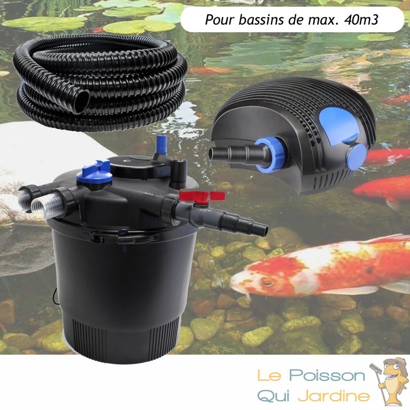 Nous vous proposons un kit promotionnel de filtration sous pression d'étangs et de pièces d'eau extérieures de 20000 litres avec poissons rouges et carpes koï.