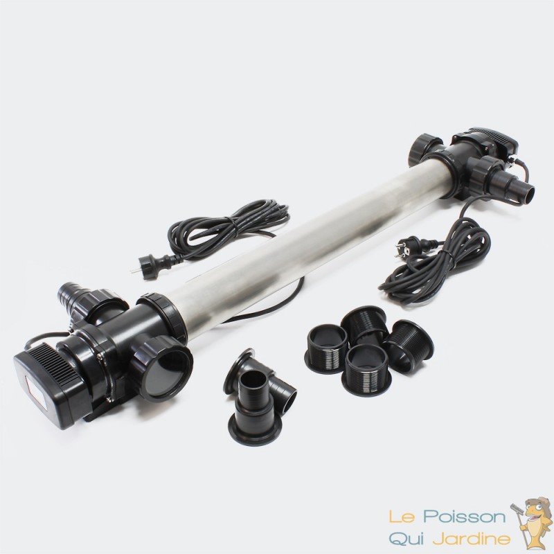 Filtre ultra violet qui stérilise et éclaircit l'eau de votre bassin de jardin: Puissance de 72W. Deux ampoules de 36W sont livrées avec le filtre ultra violet. Cet UV est puissant et en inox. C'est à dire que sa gaine est excessivement résistante aux intempéries et qu'elle ne rouille pas. C'est la meilleure qualité d'ultra violet pour bassins de jardin que vous trouverez sur le marché actuellement.