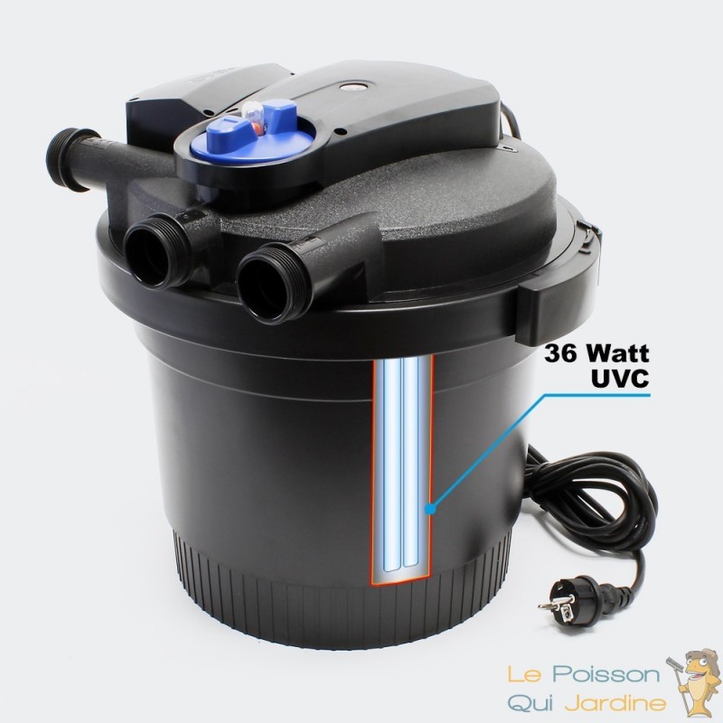 Enfin, l'ultra violet stérilisateur germicide est directement intégré dans le filtre sous pression de bassins de jardin. C'est une ultra violet d'une puissance de 36W. L'ultra violet est l'élément clef pour avoir une eau de bassin parfaitement claire et transparente. Le rayonnement UV brûlera les micro algues en suspension dans l'eau ( Ce sont ces micros algues qui rendent l'eau verte ). Une ampoule est fournie avec le filtre sous pression. Pensez à changer votre ampoule chaque année car, même si l'ampoule s'allume toujours, au bout d'un an, il n'y a plus de rayonnements ultra violets. Sans rayonnements UV, l'ampoule est totalement inefficace.