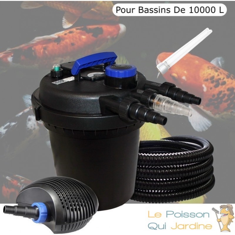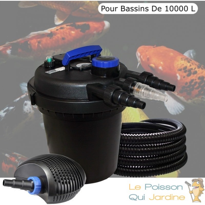 Nous vous proposons un kit promotionnel de filtration sous pression d'étangs et de pièces d'eau extérieures de 10000 litres sans poissons rouges et carpes koï. Pour un bassin avec des poissons, ce filtre de bassin convient pour une capacité de 5000 litres