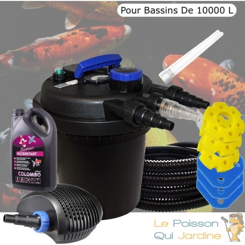 Nous vous proposons un kit promotionnel de filtration sous pression d'étangs et de pièces d'eau extérieures de 10000 litres sans poissons rouges et carpes koï. Pour un bassin avec des poissons, ce filtre de bassin convient pour une capacité de 5000 litres