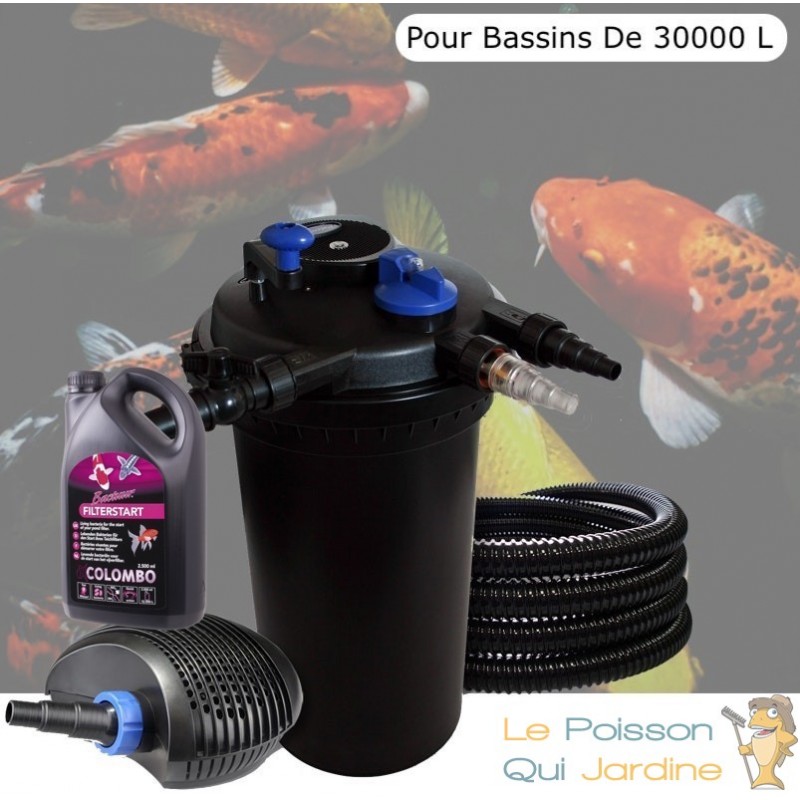 Nous vous proposons un kit promotionnel de filtration sous pression d'étangs et de pièces d'eau extérieures de 30000 litres avec poissons rouges et carpes koï.