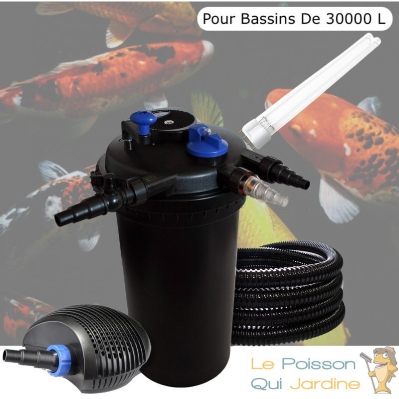 Nous vous proposons un kit promotionnel de filtration sous pression d'étangs et de pièces d'eau extérieures de 30000 litres avec poissons rouges et carpes koï.