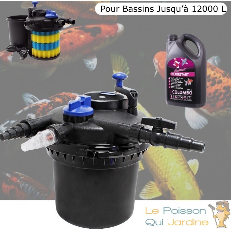 Nous vous proposons un filtre pour bassins de jardin et étangs jusqu'à 12000 litres ( sans poissons ou peu de poissons ) + Bactéries 2500 ml