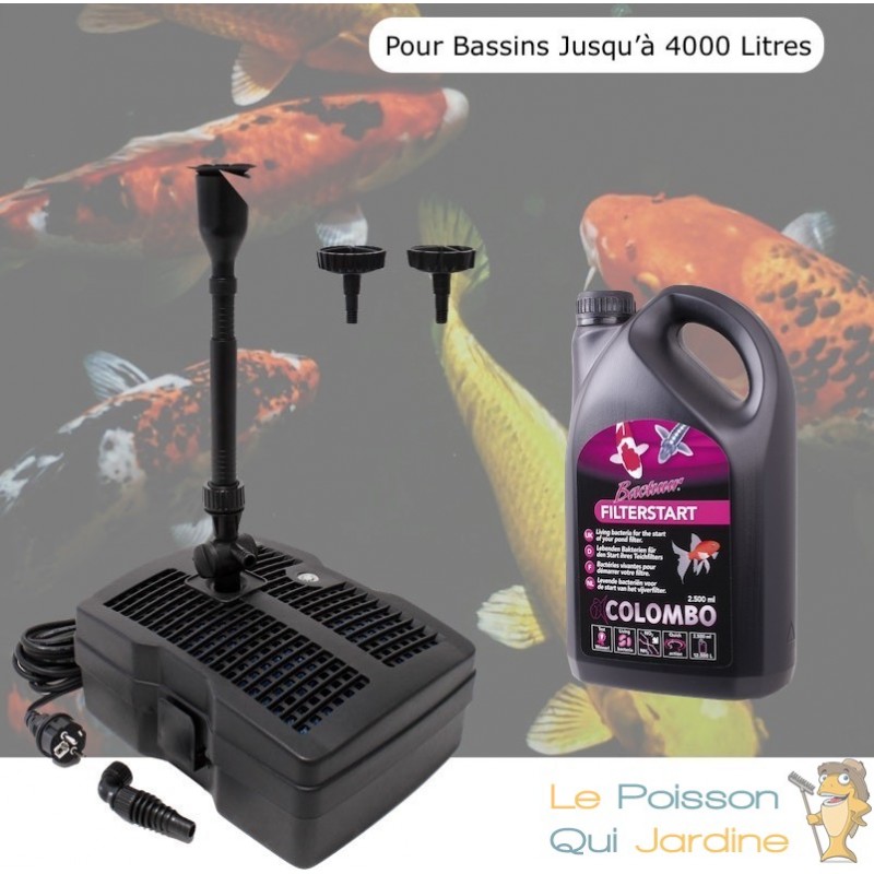 Nous vous proposons un filtre complet pour bassin de jardin. C'est un filtre tout inclus. C'est-à-dire qu'il y a une pompe à eau, un UV stérilisateur de 9W et des jets d'eau. + Bactéries 1000 ml