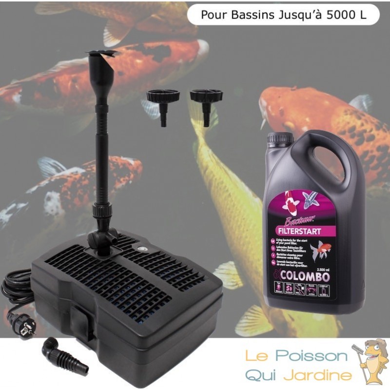 Nous vous proposons un filtre complet pour bassin de jardin. C'est un filtre tout inclus. C'est-à-dire qu'il y a une pompe à eau, un UV stérilisateur de 9W et des jets d'eau. + Bactéries 1000 ml