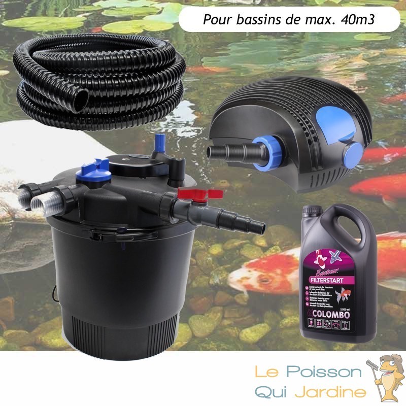 Nous vous proposons un kit promotionnel de filtration sous pression d'étangs et de pièces d'eau extérieures de 20000 litres avec poissons rouges et carpes koï.