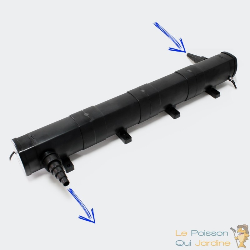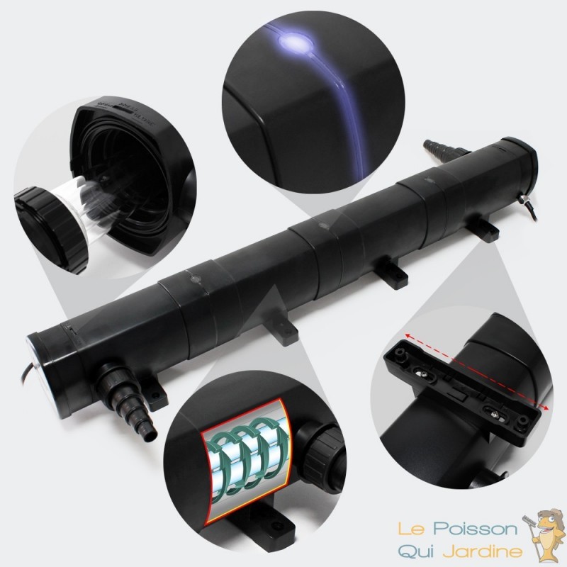 - UV ( ultra violet ) stérilisateur germicide de 72W pour ne plus avoir l'eau verte. Un ultra violet va brûler les micros algues en suspension dans l'eau. Ce sont ces algues qui créent l'eau verte. Une fois brûlées, l'eau devient claire et limpide.