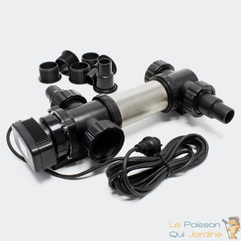 Filtre ultra violet qui stérilise et éclaircit l'eau de votre bassin de jardin: Cet UV est puissant et en inox. C'est à dire que sa gaine est excessivement résistante aux intempéries et qu'elle ne rouille pas. C'est la meilleure qualité d'ultra violet pour bassins de jardin que vous trouverez sur le marché actuellement.
