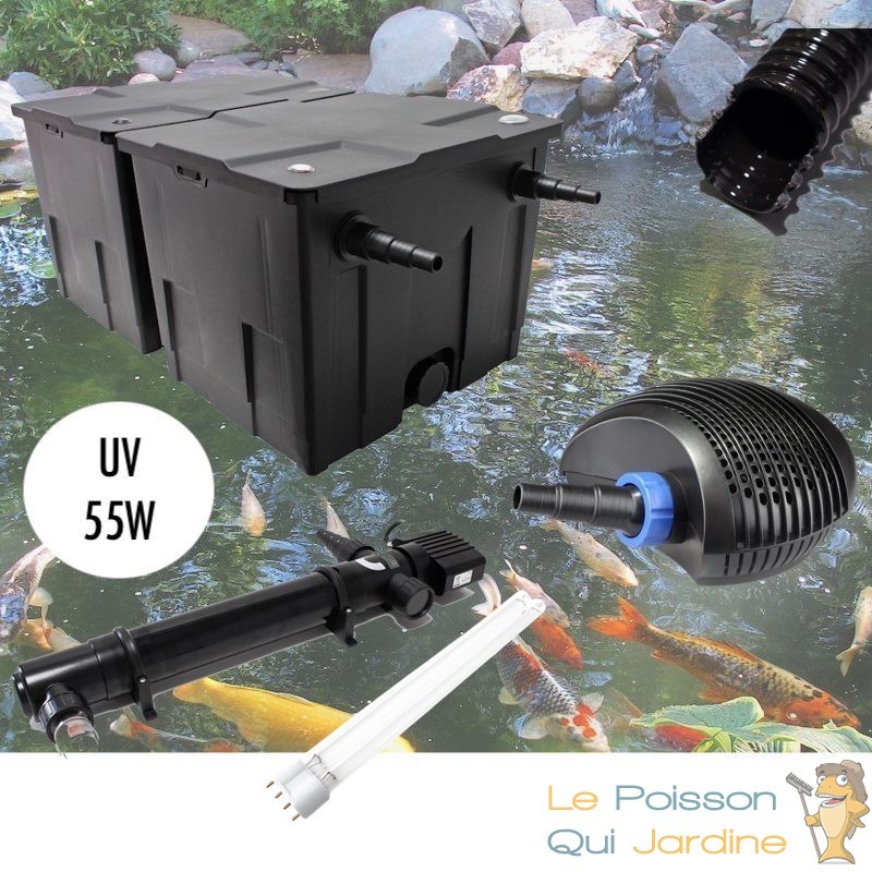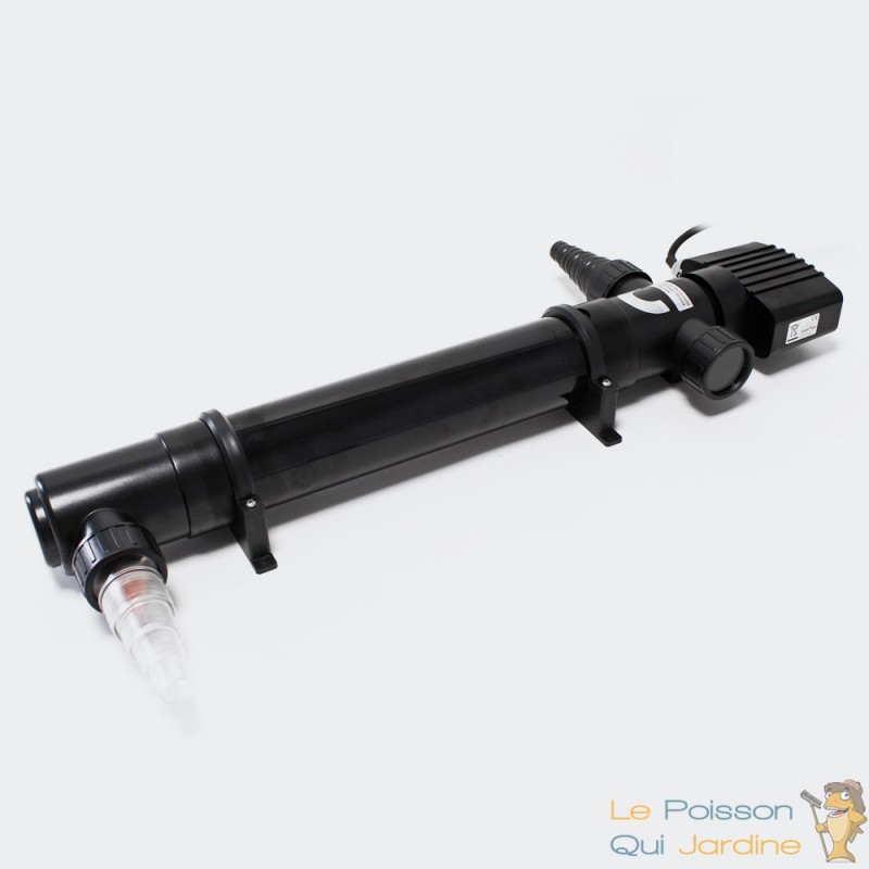 - UV ( ultra violet ) stérilisateur germicide de 55W pour ne plus avoir l'eau verte. Un ultra violet va brûler les micros algues en suspension dans l'eau. Ce sont ces algues qui créent l'eau verte. Une fois brûlées, l'eau devient claire et limpide.