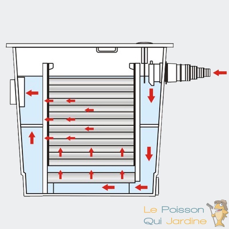 - La surface de filtration est plus grande car il y a plus de mousses et de médias filtrants