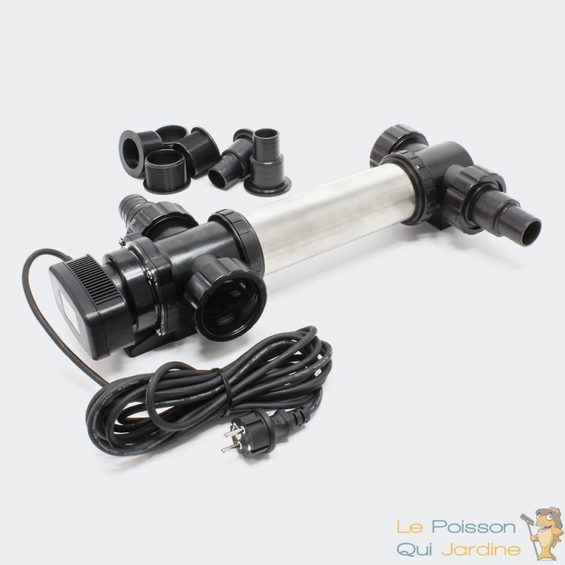 Filtre ultra violet qui stérilise et éclaircit l'eau de votre bassin de jardin: Cet UV est puissant et en inox. C'est à dire que sa gaine est excessivement résistante aux intempéries et qu'elle ne rouille pas. C'est la meilleure qualité d'ultra violet pour bassins de jardin que vous trouverez sur le marché actuellement.