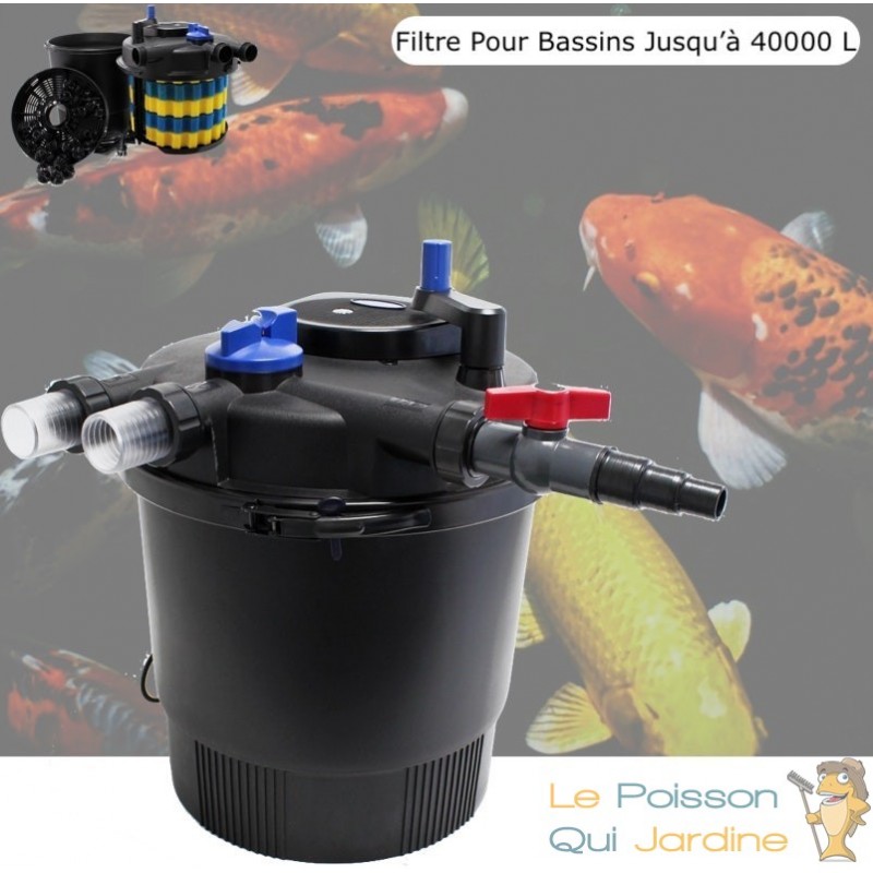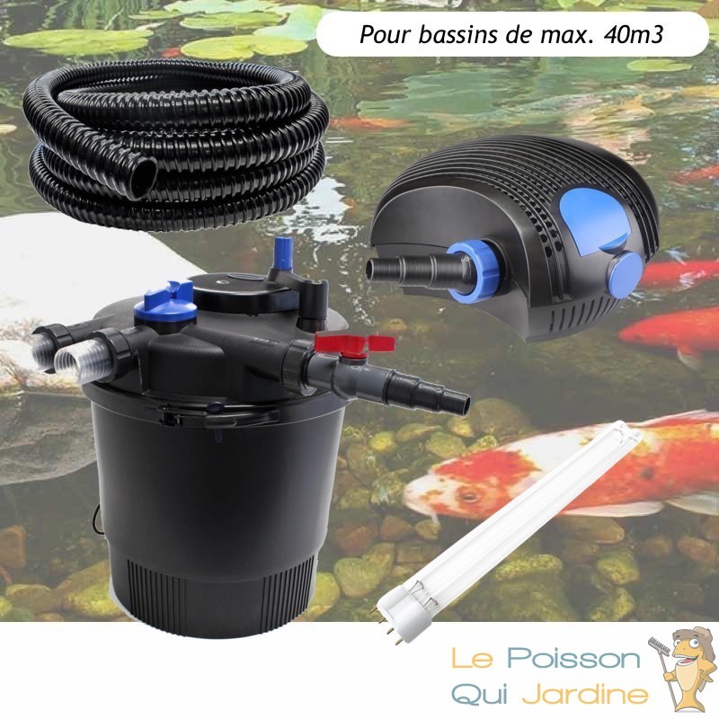Nous vous proposons un kit promotionnel de filtration sous pression d'étangs et de pièces d'eau extérieures de 20000 litres avec poissons rouges et carpes koï.