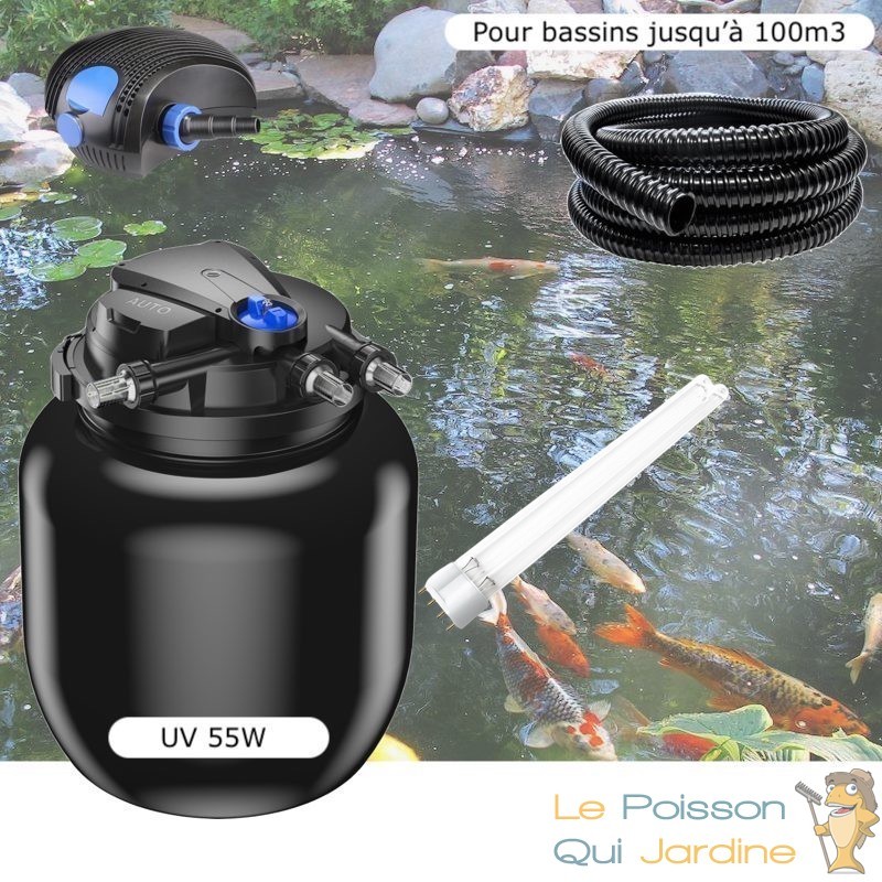 Nous vous proposons un kit promotionnel de filtration sous pression d'étangs et de pièces d'eau extérieures de 50000 litres avec poissons rouges et carpes koï. Et capacité de 100 m3 avec peu ou pas de poissons.