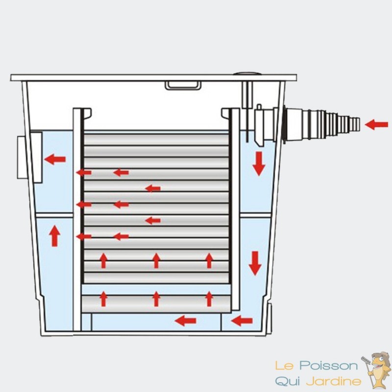 Le filtre de bassin de jardin à gravitation doit se placer au dessus de la surface de l'eau. En effet, vu qu'il travaille avec la gravitation terrestre, l'eau envoyée dans le filtre par la pompe de bassin, retombe naturellement dans le bassin de jardin.