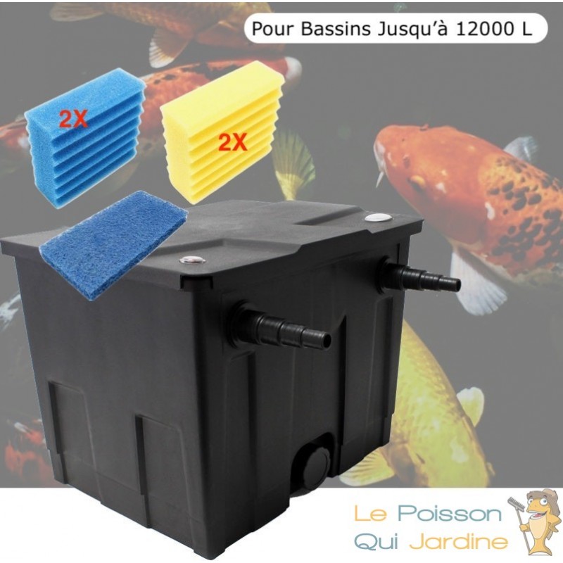 - Filtres pour bassin de 12 m3 sans ou avec peu de poissons. 6 m3 avec beaucoup de poissons