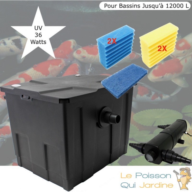 Nous vous proposons un filtre accompagné de son UV 36 Watts prévu pour des bassins jusqu'à 12000 Litres.