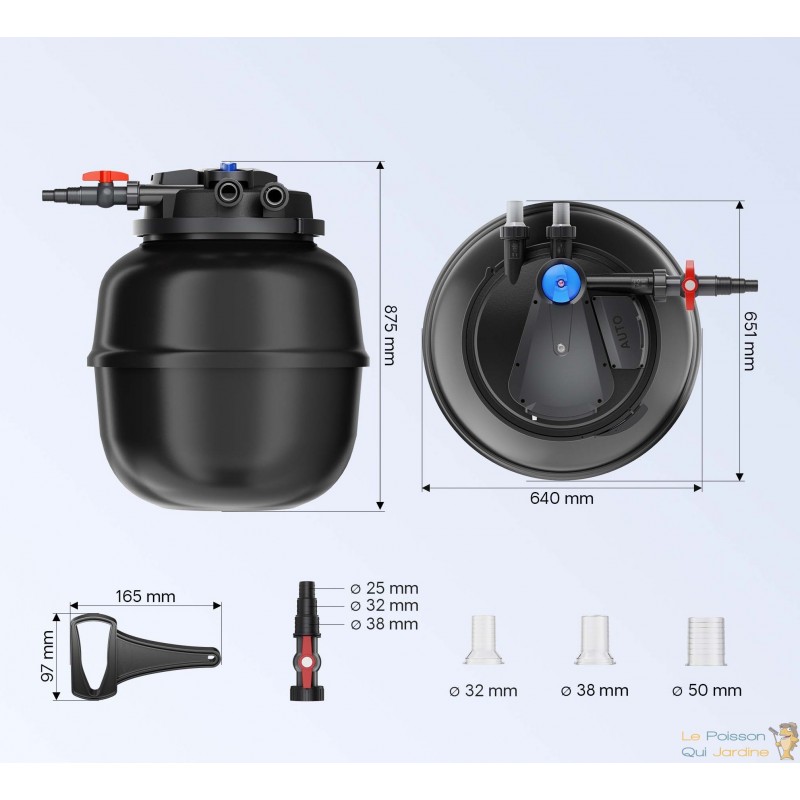 Découvrez la nouvelle génération de filtration pour les grands volumes. Ce filtre de bassin à pression biologique est conçu pour traiter des étangs allant jusqu'à 80 000 litres. Alliant une filtration mécanique et biologique de pointe à un puissant clarificateur UVC de 55W, il garantit une eau cristalline en un temps record. Grâce à son système EasyClean avec moteur de nettoyage intégré, l'entretien devient un jeu d'enfant sans même ouvrir la cuve. Une exclusivité haute performance signée Le Poisson Qui Jardine.