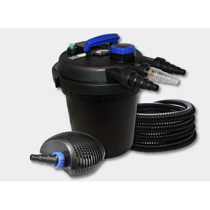 La pompe de bassin de 3000l/h pour amener l'eau au filtre est adaptée au filtre sous pression et convient parfaitement à ce dernier.