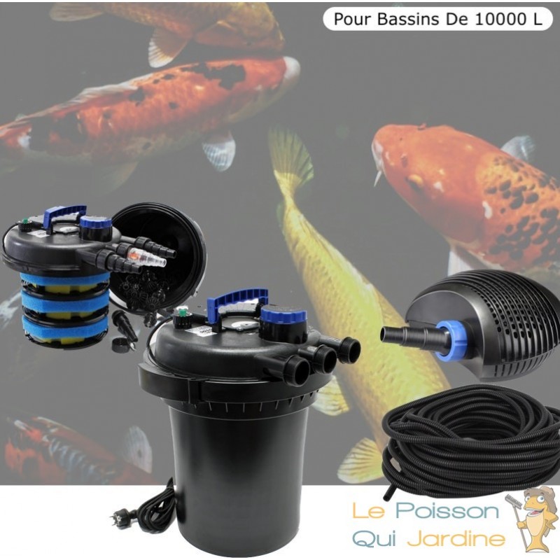 Nous vous proposons un kit promotionnel de filtration sous pression d'étangs et de pièces d'eau extérieures de 10000 litres ( 10 m3 ) avec poissons rouges, esturgeons, poissons d'eau froide et carpes koï.