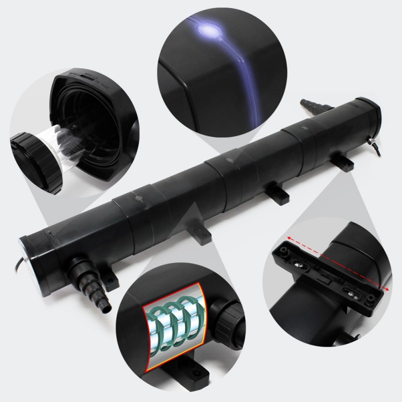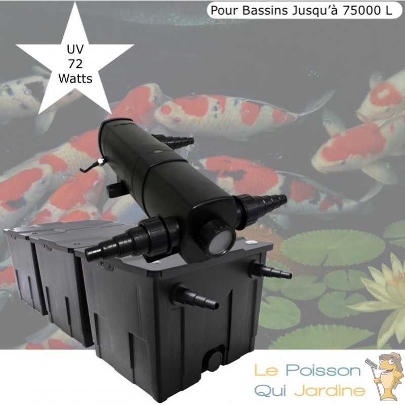 Avec un UV stérilisateur germicide 72W adaptable sur le filtre avec un morceau de tuyau. Le filtre ultra violet sert à rendre l'eau claire et limpide. Le rayonnement ultra violet brûle les algues en suspension dans l'eau du bassin de jardin.