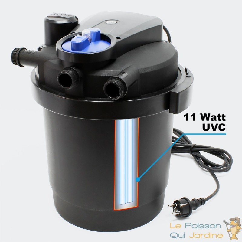 Enfin, l'ultra violet stérilisateur germicide est directement intégré dans le filtre sous pression de bassins de jardin. C'est une ultra violet d'une puissance de 11W. L'ultra violet est l'élément clef pour avoir une eau de bassin parfaitement claire et transparente. Le rayonnement UV brûlera les micro algues en suspension dans l'eau ( Ce sont ces micros algues qui rendent l'eau verte ). Une ampoule est fournie avec le filtre sous pression. Pensez à changer votre ampoule chaque année car, même si l'ampoule s'allume toujours, au bout d'un an, il n'y a plus de rayonnements ultra violets. Sans rayonnements UV, l'ampoule est totalement inefficace.