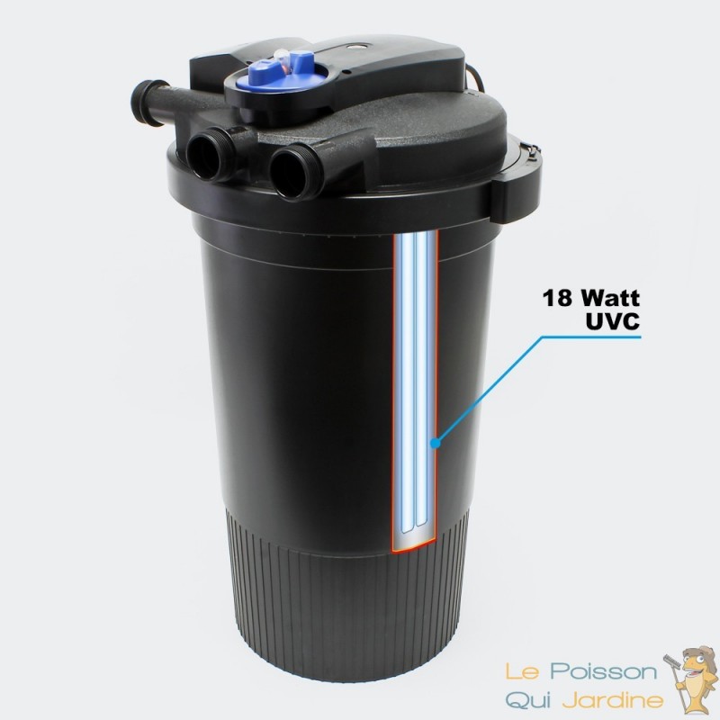 Enfin, l'ultra violet stérilisateur germicide est directement intégré dans le filtre sous pression de bassins de jardin. C'est une ultra violet d'une puissance de 18W. L'ultra violet est l'élément clef pour avoir une eau de bassin parfaitement claire et transparente. Le rayonnement UV brûlera les micro algues en suspension dans l'eau ( Ce sont ces micros algues qui rendent l'eau verte ). Une ampoule est fournie avec le filtre sous pression. Pensez à changer votre ampoule chaque année car, même si l'ampoule s'allume toujours, au bout d'un an, il n'y a plus de rayonnements ultra violets. Sans rayonnements UV, l'ampoule est totalement inefficace.
