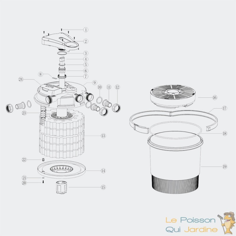 Le débit de la pompe recommandé pour ce filtre est de maximum 10000 l/h ( selon la taille du bassin de jardin )