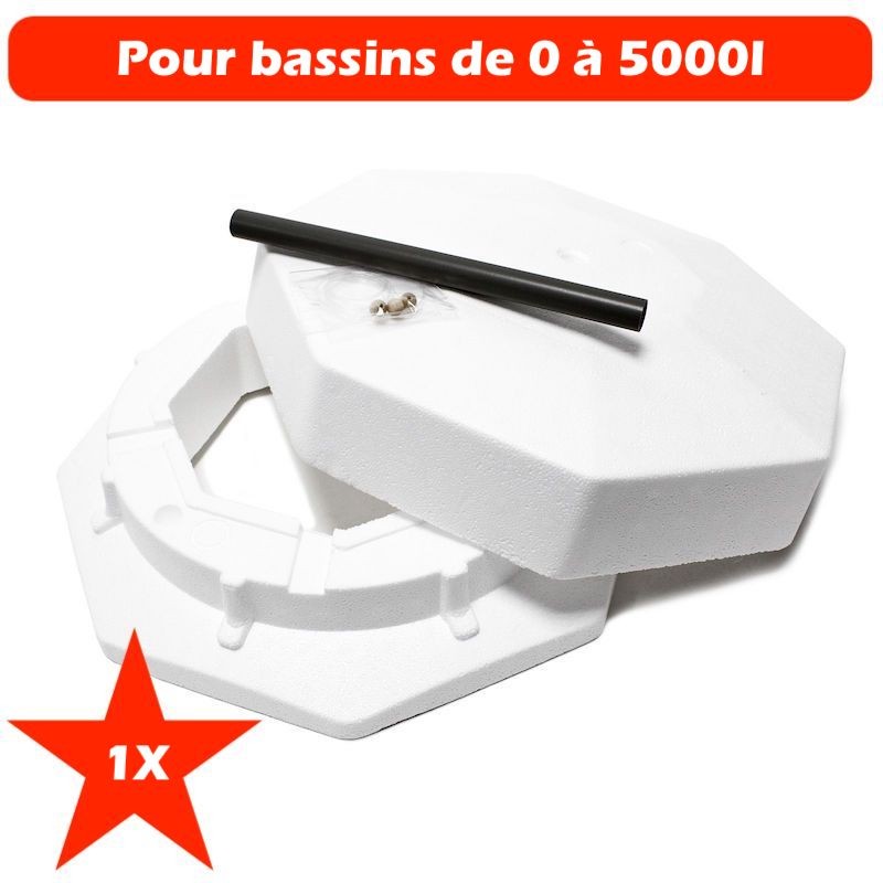 Si l'utilisation d'un dispositif antigel est négligée et que la glace est déjà présente, il est crucial de ne pas percer la surface de l'eau. Les pressions générées et les ondes sonores qui en résultent pourraient perturber les poissons et interrompre leur période d'hibernation. Il est préférable de faire fondre la glace délicatement à l'aide d'un sèche-cheveux ou en utilisant de l'eau chaude. Dans ce contexte, le chauffe-étang octogonal en polystyrène (frigolite) avec son tuyau d'aération central s'avère très utile. Pendant les périodes de gel, ce dispositif flotte à la surface de l'eau et gèle en même temps que le bassin. Le tuyau d'aération central permet aux biogaz de s'échapper, prévenant ainsi toute accumulation potentiellement nuisible.