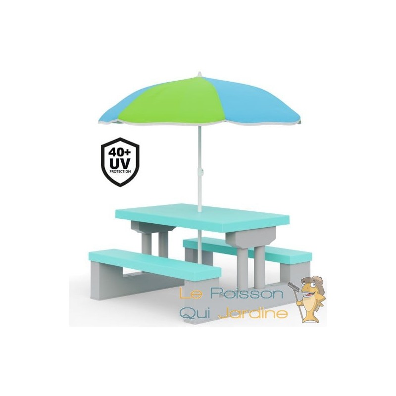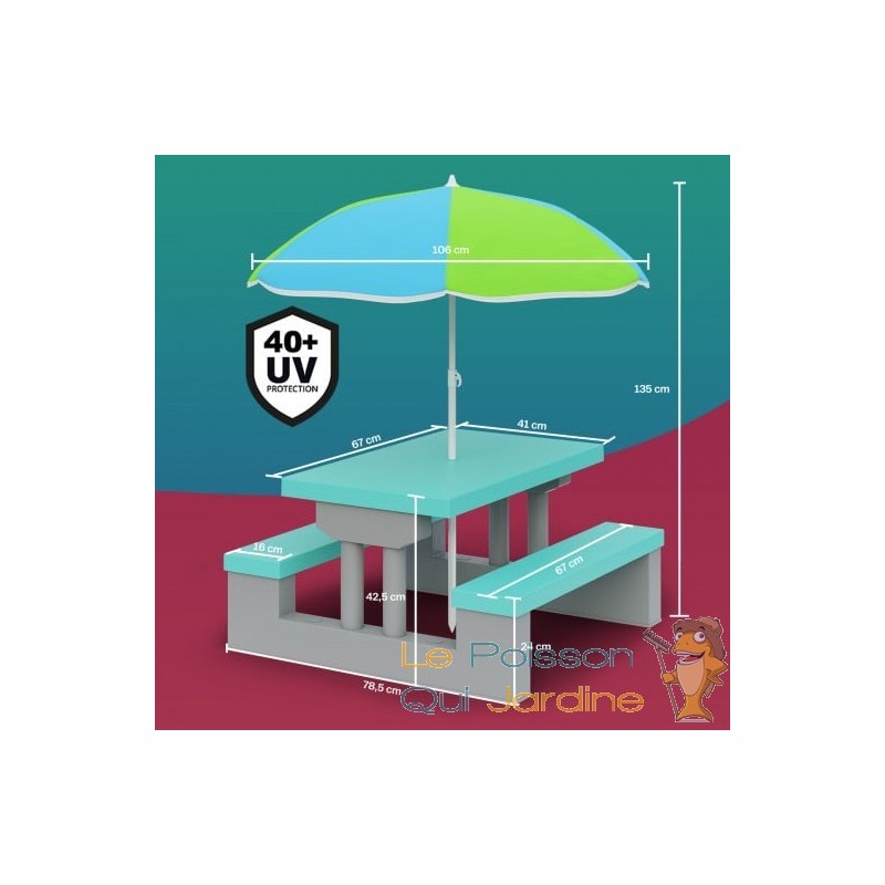 Le petit parasol inclus dans l'ensemble offre une protection solaire suffisante pendant les jeux en extérieur. Cela permet aux enfants de profiter du jardin ou de la terrasse sans craindre les effets néfastes du soleil, tels que les coups de soleil. La sécurité des enfants est donc renforcée lorsqu'ils jouent à l'extérieur, ce qui est un avantage important pour les parents.