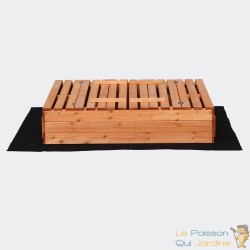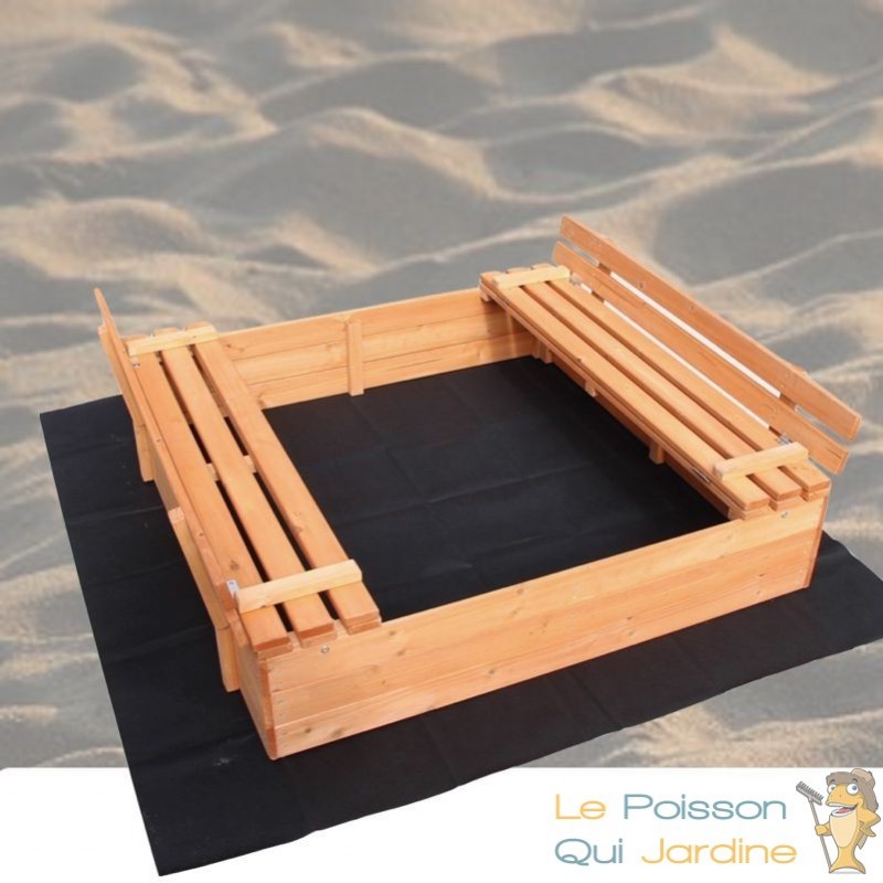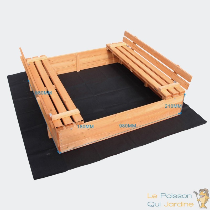 De plus, les bacs à sable en bois, que nous proposons, sont munis de deux bancs avec dossier et d'un tapis en tissu pour éviter la prolifération des mauvaises herbes.