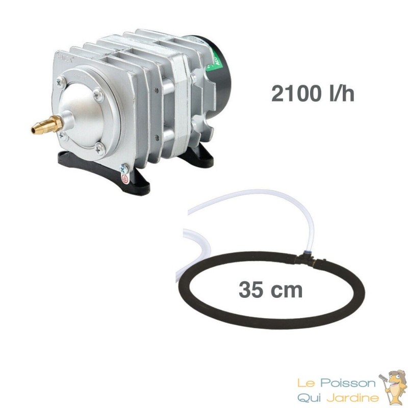 - Un compresseur de 2100 l/h et un diffuseur cercle de 35 cm de diamètre. 3 m de tuyau sont fournis