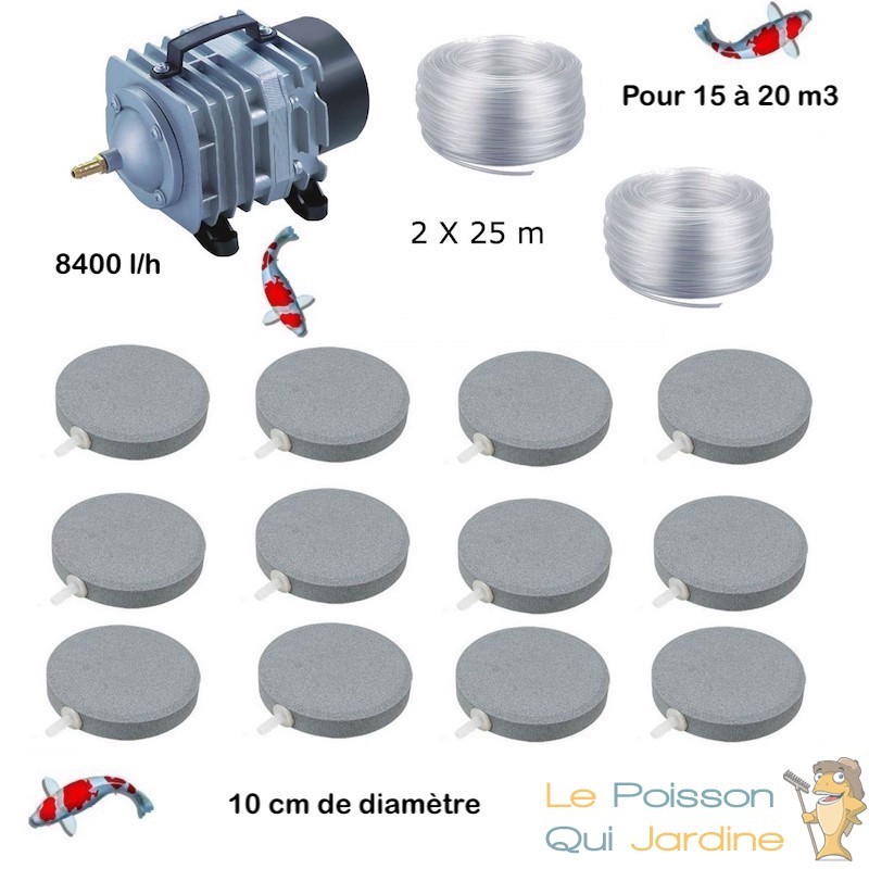 Pack complet d'oxygénation et set d'aération pour bassins de jardin et étangs de 15000 à 20000 litres. Ce set est aussi parfait pour les pièces d'eau extérieures contenant des carpes Koï, ides, carpes amour, esturgeons ou encore des poissons de nos rivières comme les brèmes, truites, ablettes ou autres brochets