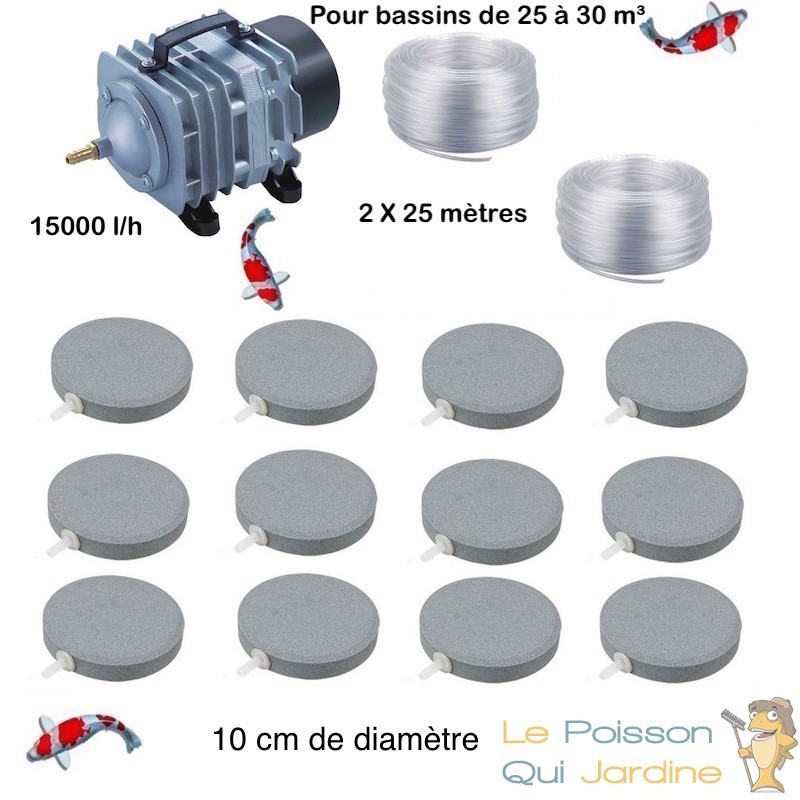 Ce kit d'aération comprend une pompe à air bassin à gros débit d'air et pour gros volumes d'eau, ainsi que la tuyauterie, les diffuseurs d'air et tout ce qui est nécessaire pour mettre en place une aération optimale et efficace pour votre bassin de jardin.