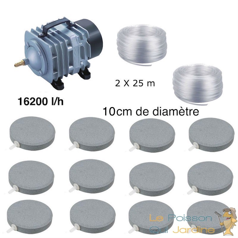 Set d'aération pour bassins de jardin et étangs de 30000 à 50000 litres. Inclus un compresseur aérateur de bassins de jardin de 16,2 m3/h.