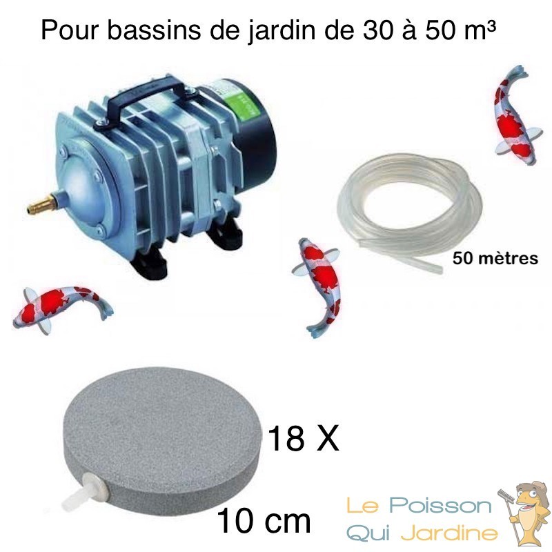 Set d'aération pour bassins de jardin et étangs de 30000 à 50000 litres. Inclus un compresseur aérateur de bassins de jardin de 16,2 m3/h.