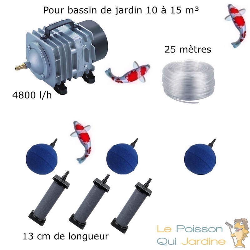 Pack complet d'oxygénation et d'aération pour bassin de jardin et étangs de 10 à 15 m3, idéal pour les pièces d'eau extérieures contenant des carpes Koï, poissons rouges, ides, carpes amour et herbivore ou encore esturgeons.